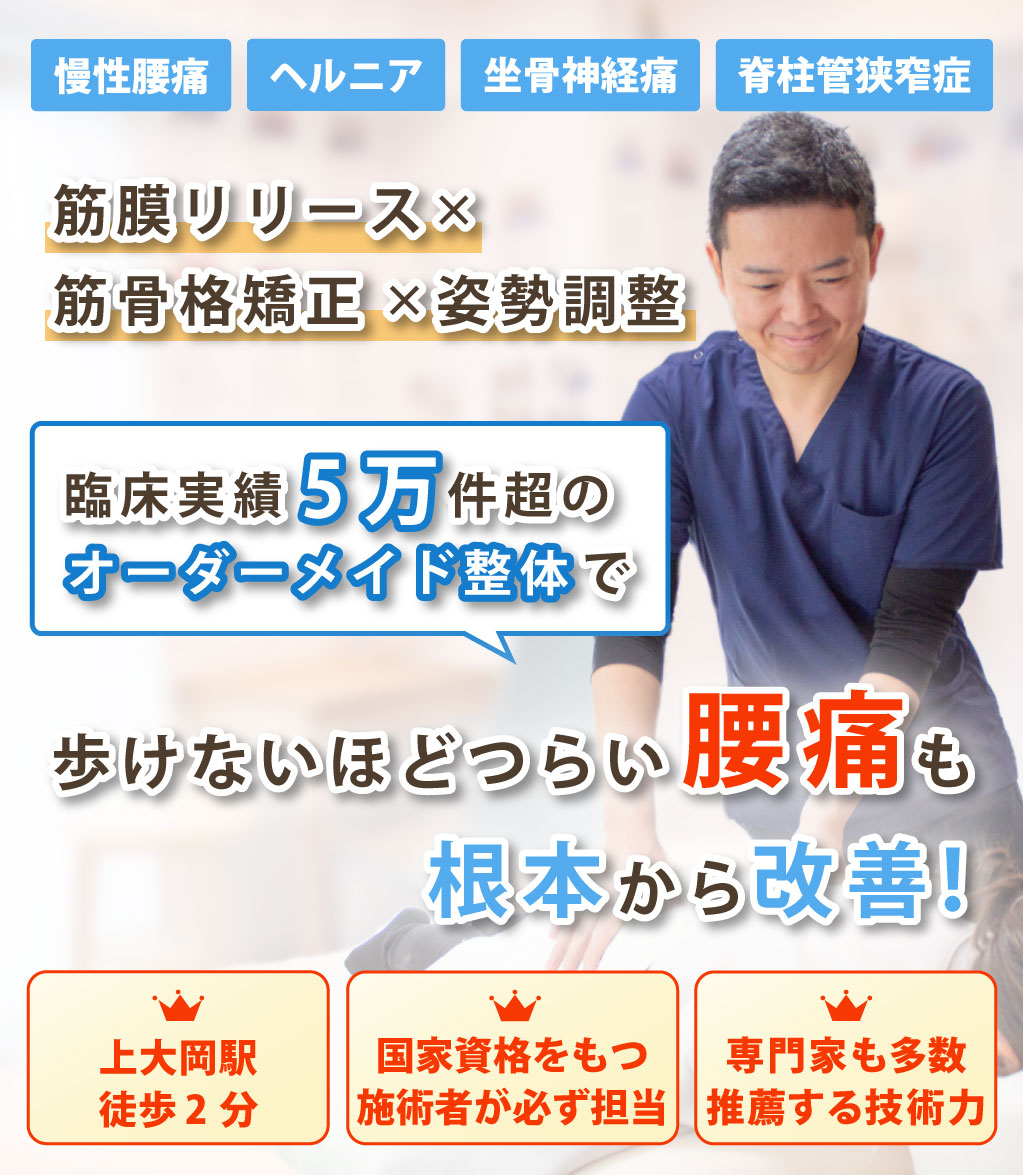 慢性的な腰痛、椎間板ヘルニア、ぎっくり腰、坐骨神経痛など腰痛の経験施術が豊富な整体院です。施術して終わりではなく、その後の自宅でできるセルフストレッチや生活習慣の指導もいたします。